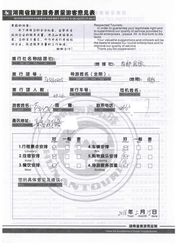 2月份,青島薛女士一行5位貴賓與湖南西部(張家界)中國(guó)國(guó)際旅行社工作人員——向翅取得聯(lián)系,經(jīng)過(guò)商談,雙方達(dá)成協(xié)議并簽訂旅游合同,于2月11日抵達(dá)張家界,開(kāi)始張家界之旅。此次行程是由我社優(yōu)秀導(dǎo)游——田杉負(fù)責(zé)旅游接待工作,田杉在旅游過(guò)程中講解詳細(xì),客人也很滿意。同時(shí)也感謝薛女士一行貴賓選擇湖南西部(張家界)中國(guó)國(guó)際旅行社,以及您對(duì)湖南西部國(guó)旅的信任與支持。我們會(huì)繼續(xù)努力,做好旅游接待工作。期待下一次與您的合作,祝您愉快!