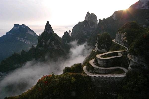 天門(mén)山盤(pán)山公路共有99道急彎,其中最為險(xiǎn)峻的一段是經(jīng)過(guò)科學(xué)的論證及設(shè)計(jì)才得以修建成功的,大家可以通過(guò)圖片看到其中公路之險(xiǎn)峻。