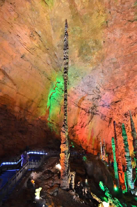 跨過(guò)中國(guó)游覽洞穴中跨度最大的石拱橋天仙橋,便進(jìn)入黃龍洞第三層天柱街了。天柱街是天上的街市,是神仙做生意的地方。天柱街以繁華似錦、春意盎然的“天上街市”為中心,西街花果山石柱石花重重疊疊,東街“天堂宮” 穹形洞頂高大幽深。順著長(zhǎng)長(zhǎng)的崩塌的斜坡往上看,兩根大石柱及壁流石被地下水溶蝕形成了奇妙的空洞,因從不同的地方可以敲出奇妙而悅耳的音符得名“石琴山”。一九八四年,中央電視臺(tái)拍攝電視專(zhuān)題片《地下明珠——黃龍洞》的時(shí)候,就是在這兩根石柱上敲擊出了一曲完整的《賣(mài)報(bào)歌》。
