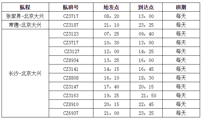 南航冬春換季后還全面優(yōu)化了各地往返北京大興的航線網(wǎng)絡。其中,張家界至北京大興航班為每天一班的朝發(fā)夕歸航班,去程CZ3717(張家界-大興)航班08:20張家界出港,回程CZ3164(大興-張家界)航班17:50北京大興起飛,時刻非常方便出行,張家界始發(fā)至大興單程僅450元起(不含稅)。常德每天往返北京大興1班;長沙每天往返大興10班(2班為寬體機),均提供“精品航線”服務。此外,北京大興往返廣州、深圳、上海、長沙、貴陽、珠海、?、三亞、哈爾濱、大連、杭州、重慶、西安、烏魯木齊等全國主要城市均為早中晚全天候航班布局,方便旅客航空出行和中轉銜接。